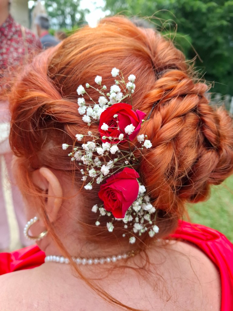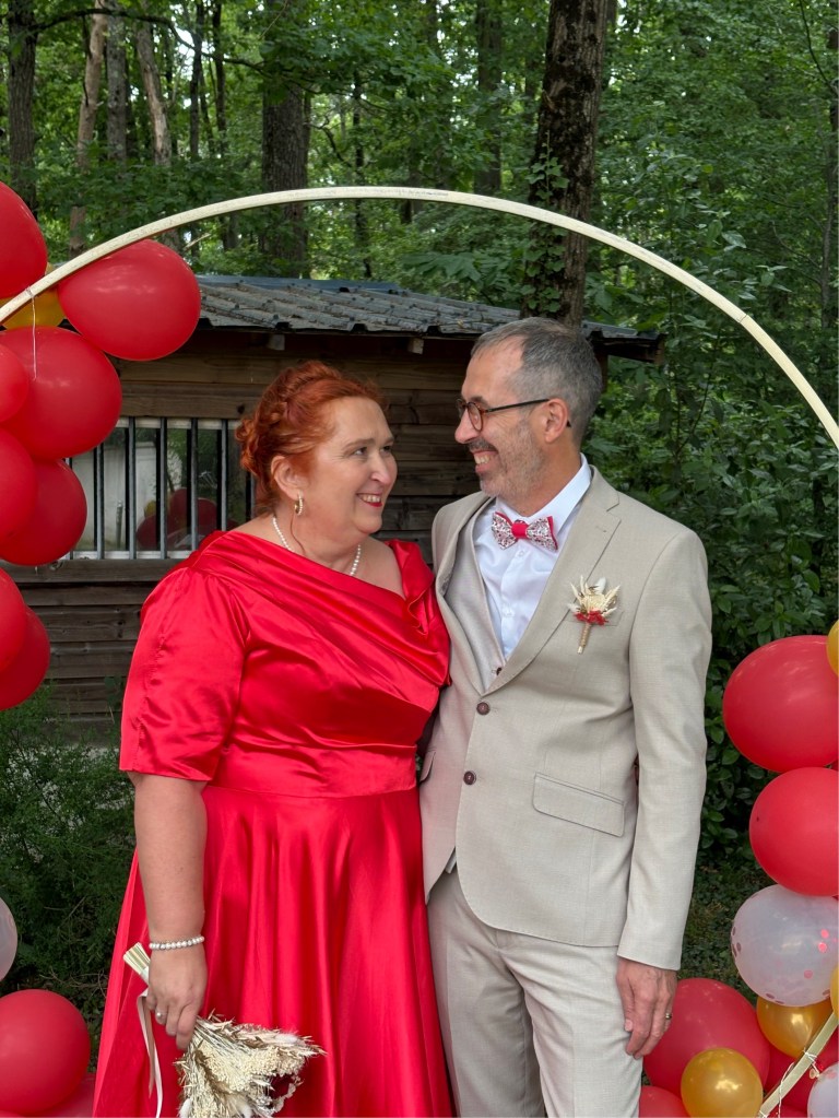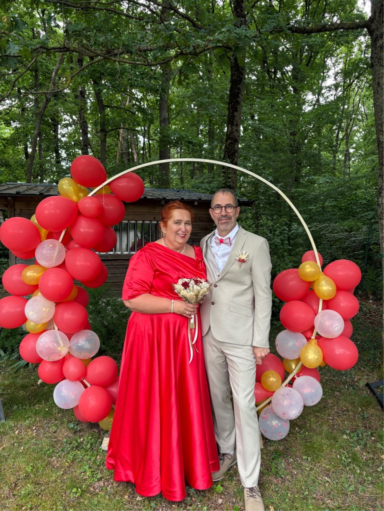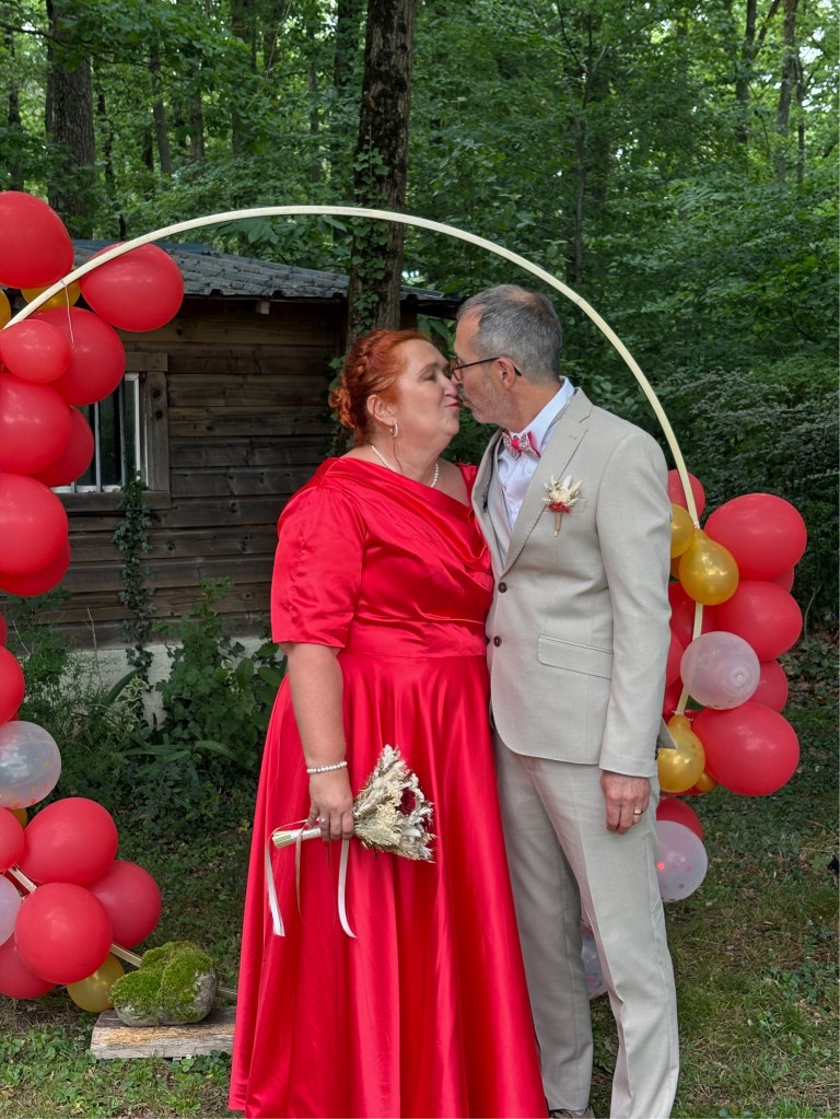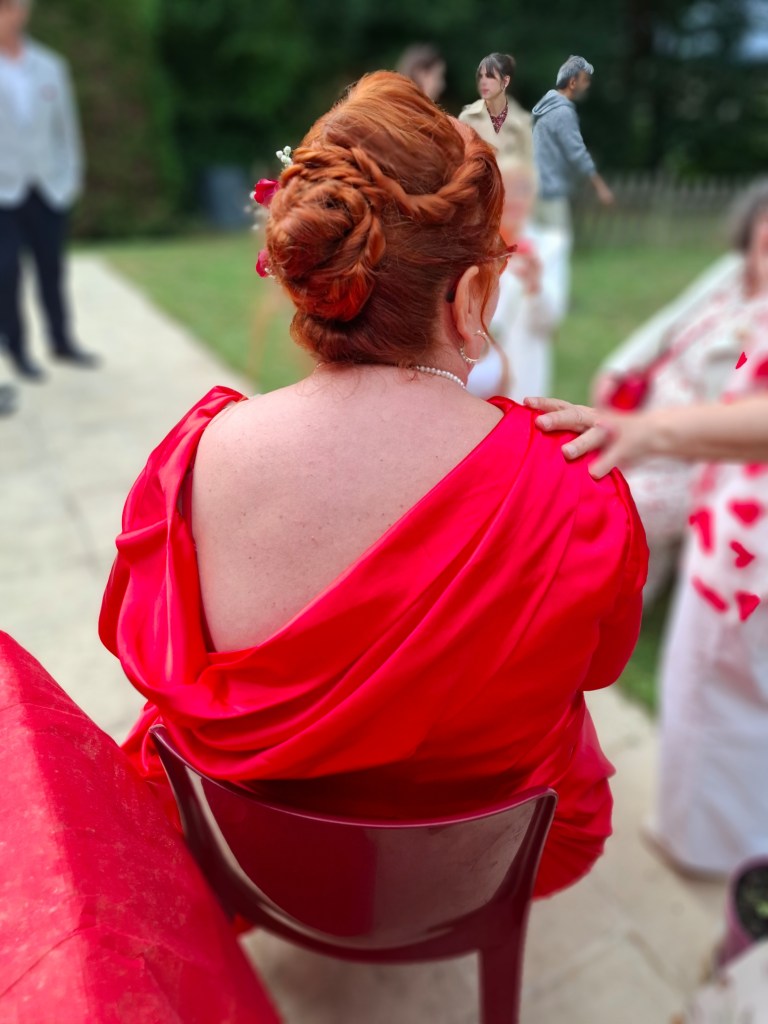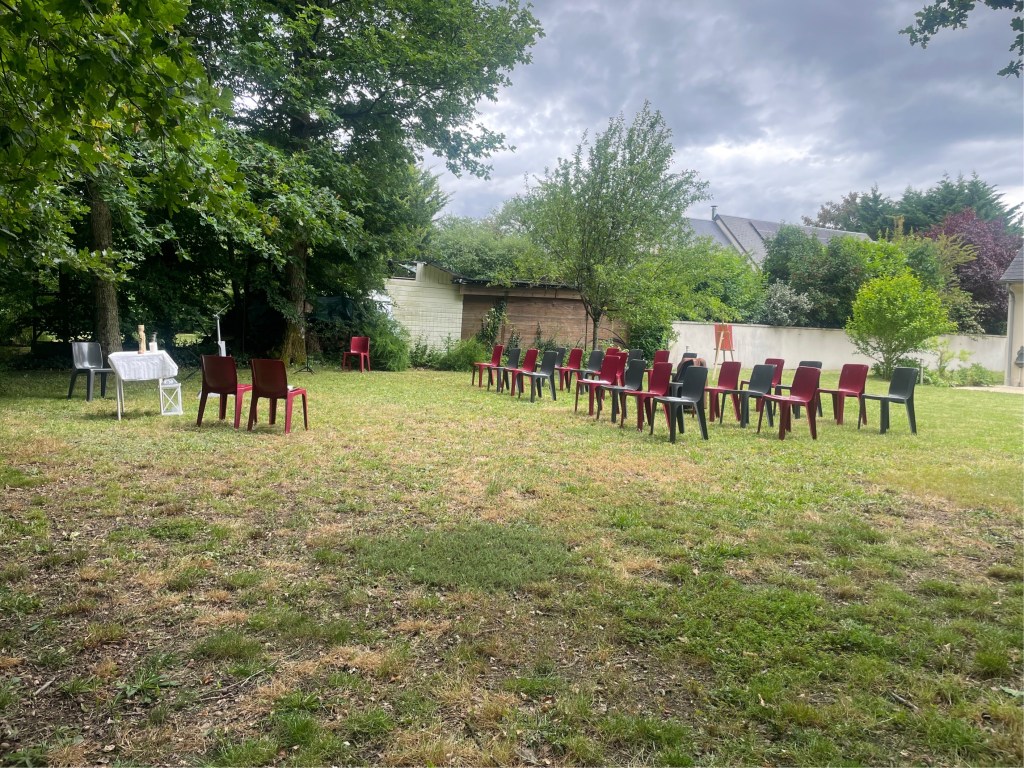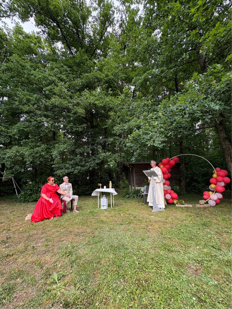 La cérémonie s’est déroulée à l’extérieur, dans le jardin d’un couple d’ami et aussi à l’intérieur car la pluie a décidé de s’inviter ! Le vin d’honneur a pu se faire dans le jardin et les invité.e.s ainsi que les mariés ont pu profiter de l’extérieur. Le buffet du soir s’est déroulé au chaud et bien animé par leurs enfants qui ont fait plusieurs jeux pour mettre l’ambiance à cette belle soirée.